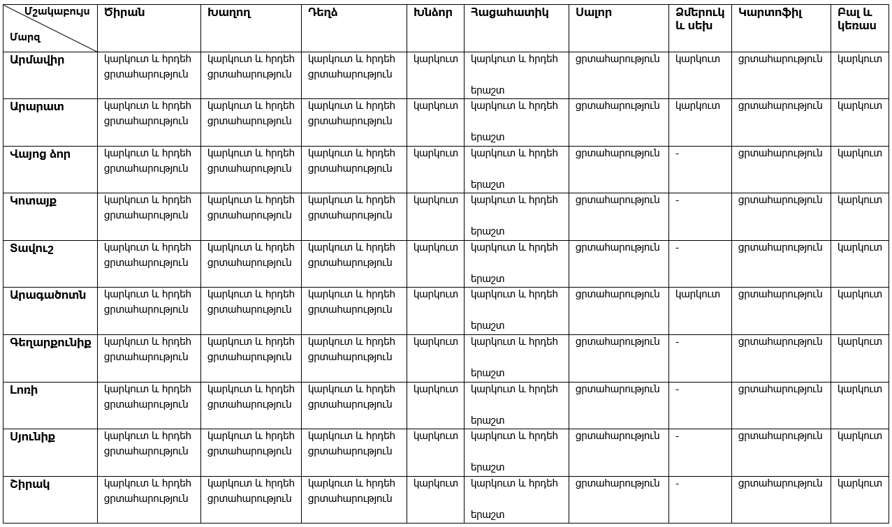խաղող, ծիրան, դեղձ, խնձոր, հացահատիկ, սալոր, կարտոֆիլ, ձմերուկ, սեխ |